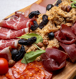 (Njegoški pršut, goveđi pršut, kulen, kraški vrat, duvan čvarci, čeri paradajz, rukola, masline)